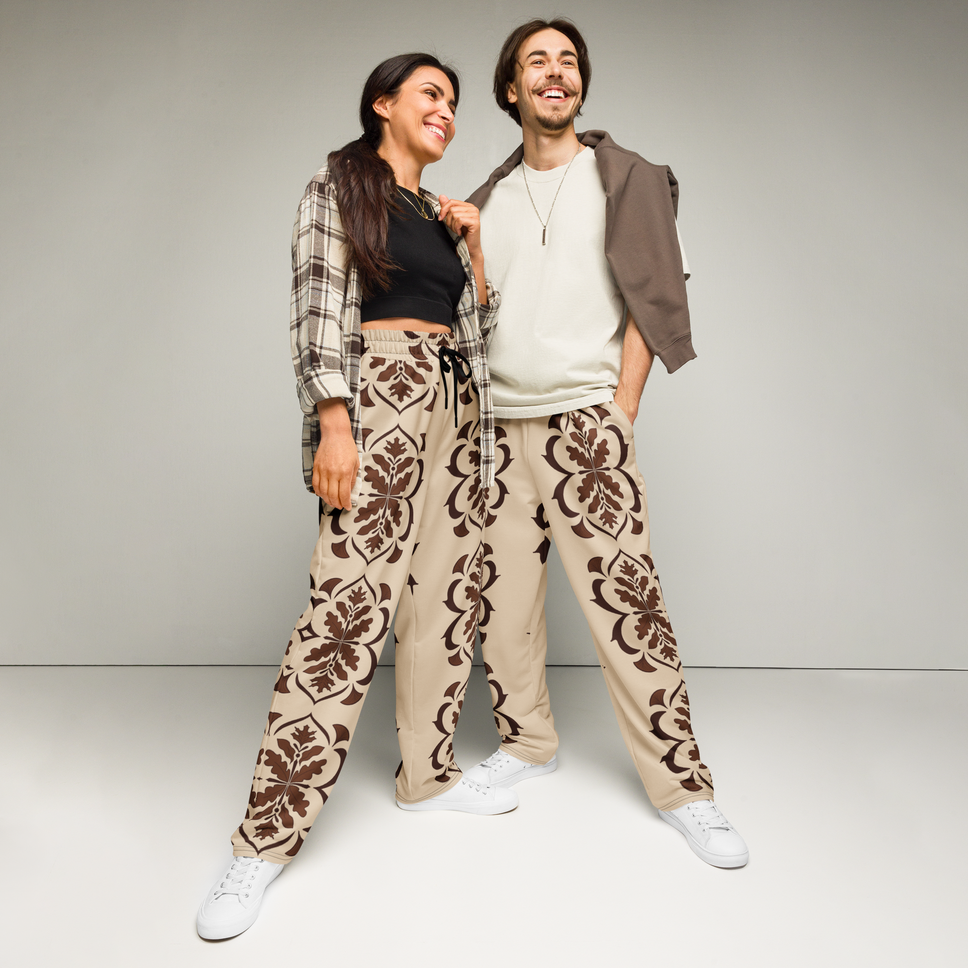 Rediscover ’90s fashion with these all-over print wide-leg joggers. Ideal for athleisure looks and casual outings, they offer a unisex fit and handy side pockets.